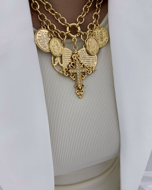 Expresse sua espiritualidade com força e beleza. Este acessório dourado com corrente dupla e pingentes religiosos é uma peça marcante, feita para mulheres de fé que não abrem mão de elegância e identidade. O destaque vai para a cruz central com detalhes em strass, cercada por 6 medalhas católicas, incluindo orações e símbolos de proteção.