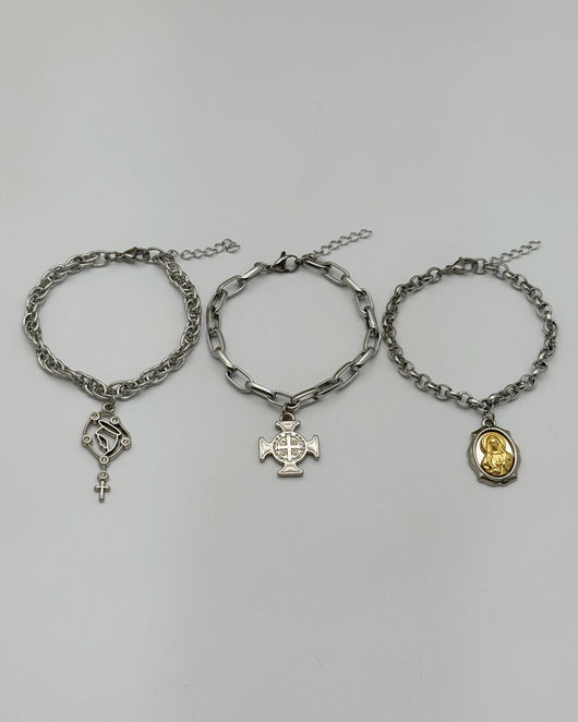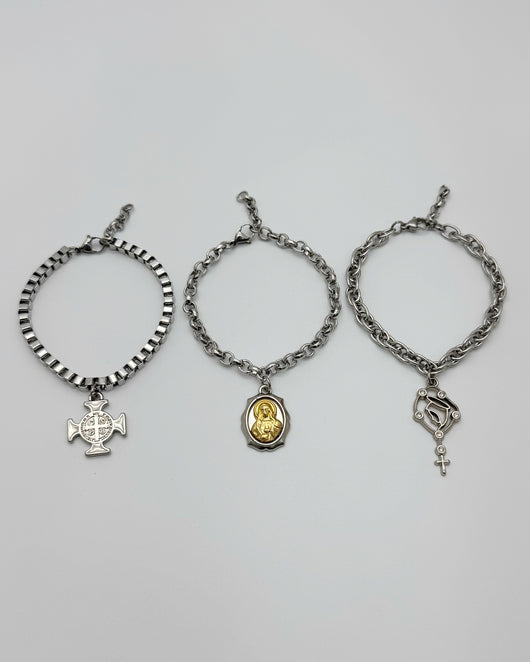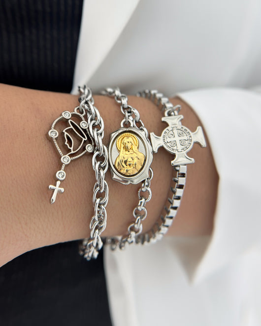 Kit com Três pulseiras, Nossa Senhora das Lágrimas, Sagrado Coração de Maria, e Cruz de São Bento