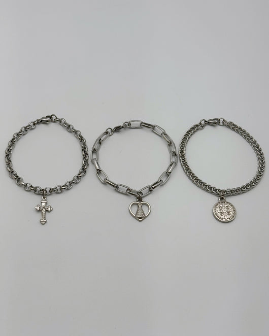 Kit Três pulseiras, São Bento, Cruz com Jesus Cristo e Aparecida