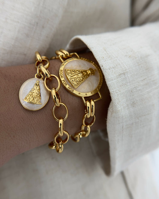 Ideal para mulheres que desejam expressar sua devoção com beleza, as pulseiras podem ser usadas juntas ou separadamente, compondo combinações modernas e cheias de significado.