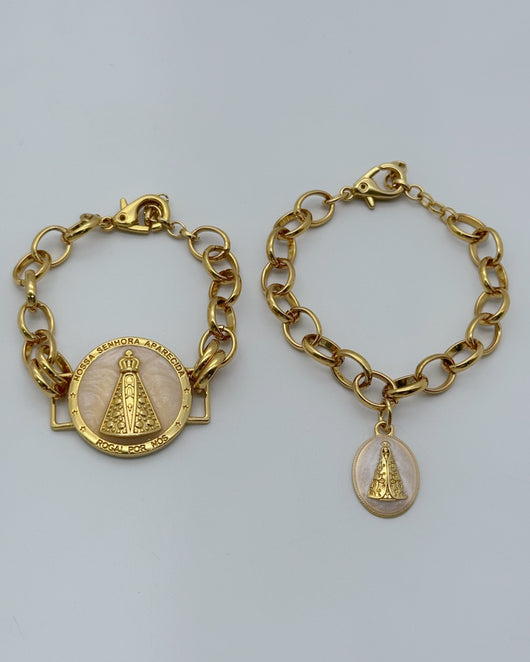 Kit Pulseiras Nossa Senhora Aparecida Madrepérola Dourado