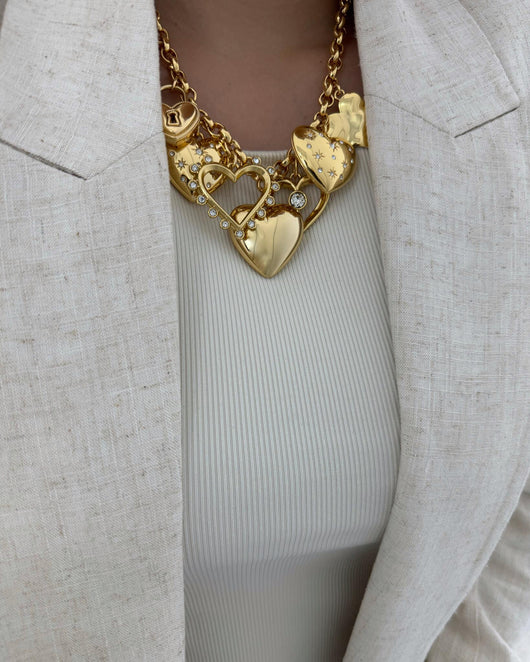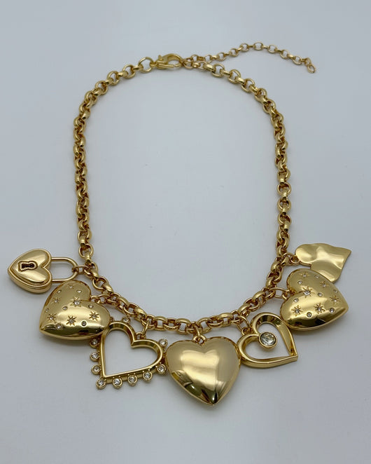 Este colar é uma verdadeira declaração de estilo e personalidade. Com sete pingentes de coração em diferentes formatos e acabamentos, ele combina romantismo e ousadia em uma única peça. Cada coração possui detalhes únicos — alguns cravejados com microzircônias, outros com brilho espelhado ou recortes modernos — formando uma composição marcante e cheia de significado.
